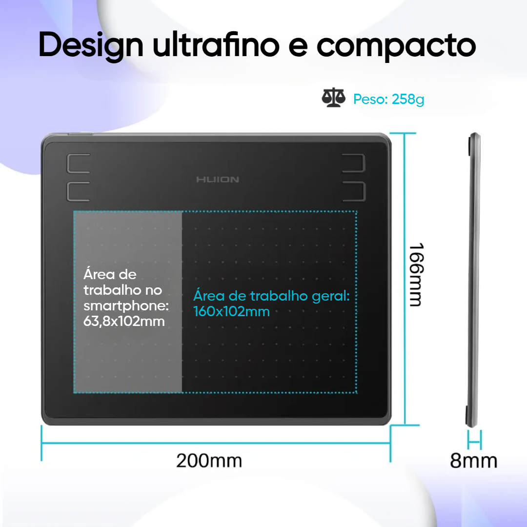 O Huion HS64 é um tablet de desenho revolucionário, com área ativa de 6 x 4 polegadas e design ultrafino, que redefine a forma como artistas e profissionais criativos trabalham. Pesando quase nada e com apenas 8 mm de espessura, ele é tão portátil quanto um smartphone, permitindo que você leve seu estúdio de arte para qualquer lugar. Seja você um estudante, um artista profissional ou um entusiasta, o HS64 garante que a criatividade não tenha limites. Com sua praticidade, você estará sempre preparado para capturar ideias e transformá-las em realidade, onde quer que esteja.