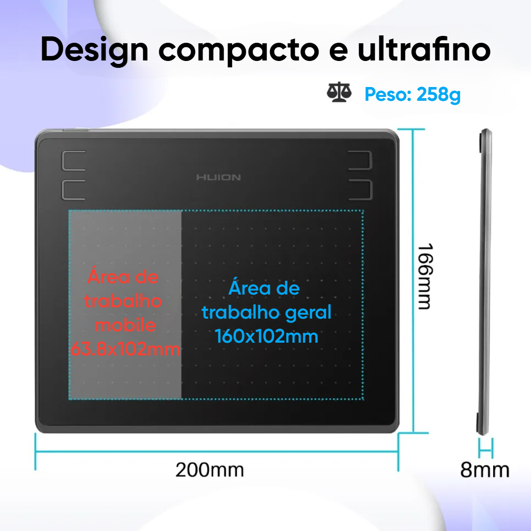 - Com apenas 8 mm de espessura, o Huion HS64 é tão leve quanto um telefone celular, sendo fácil de transportar e ideal para desenhar em qualquer lugar.