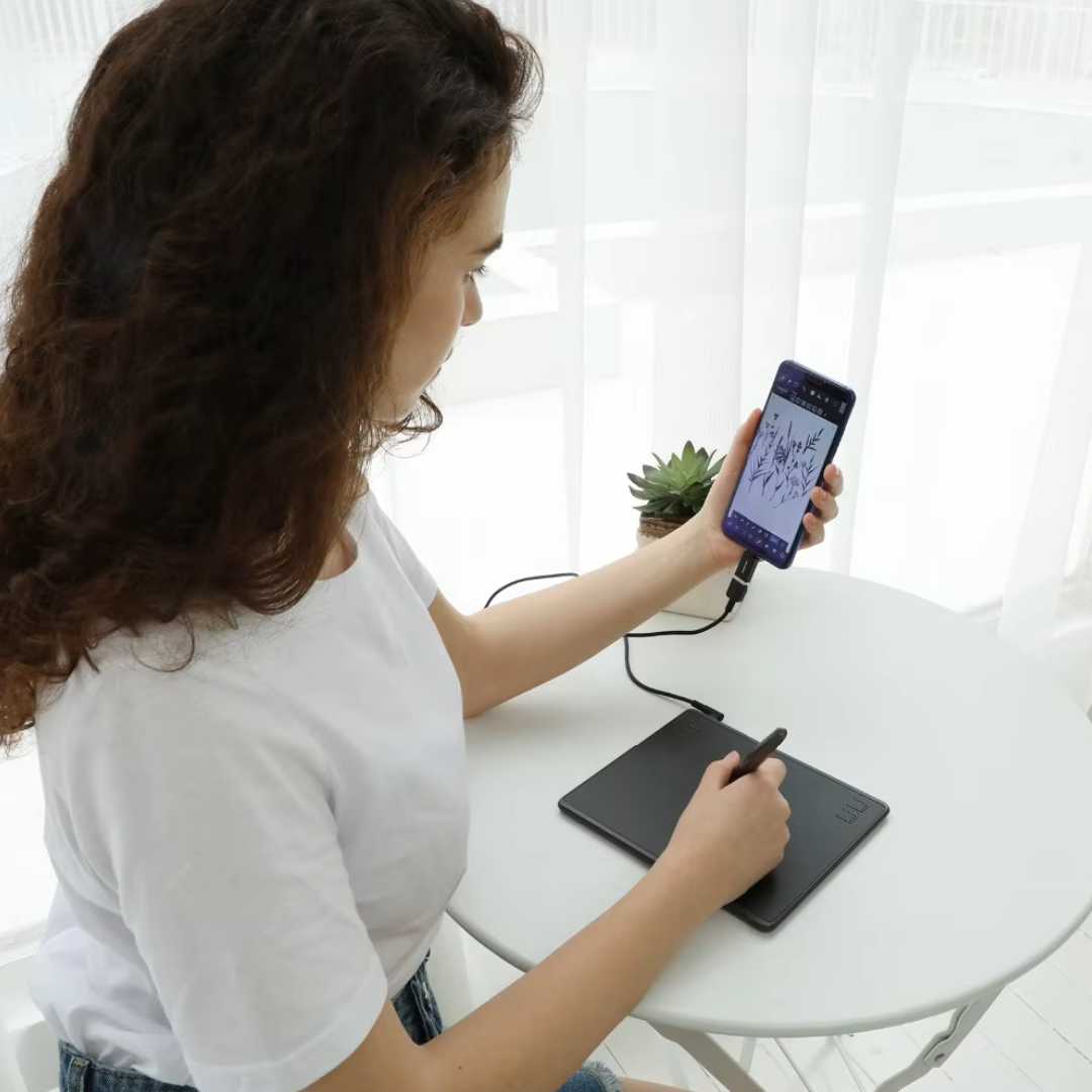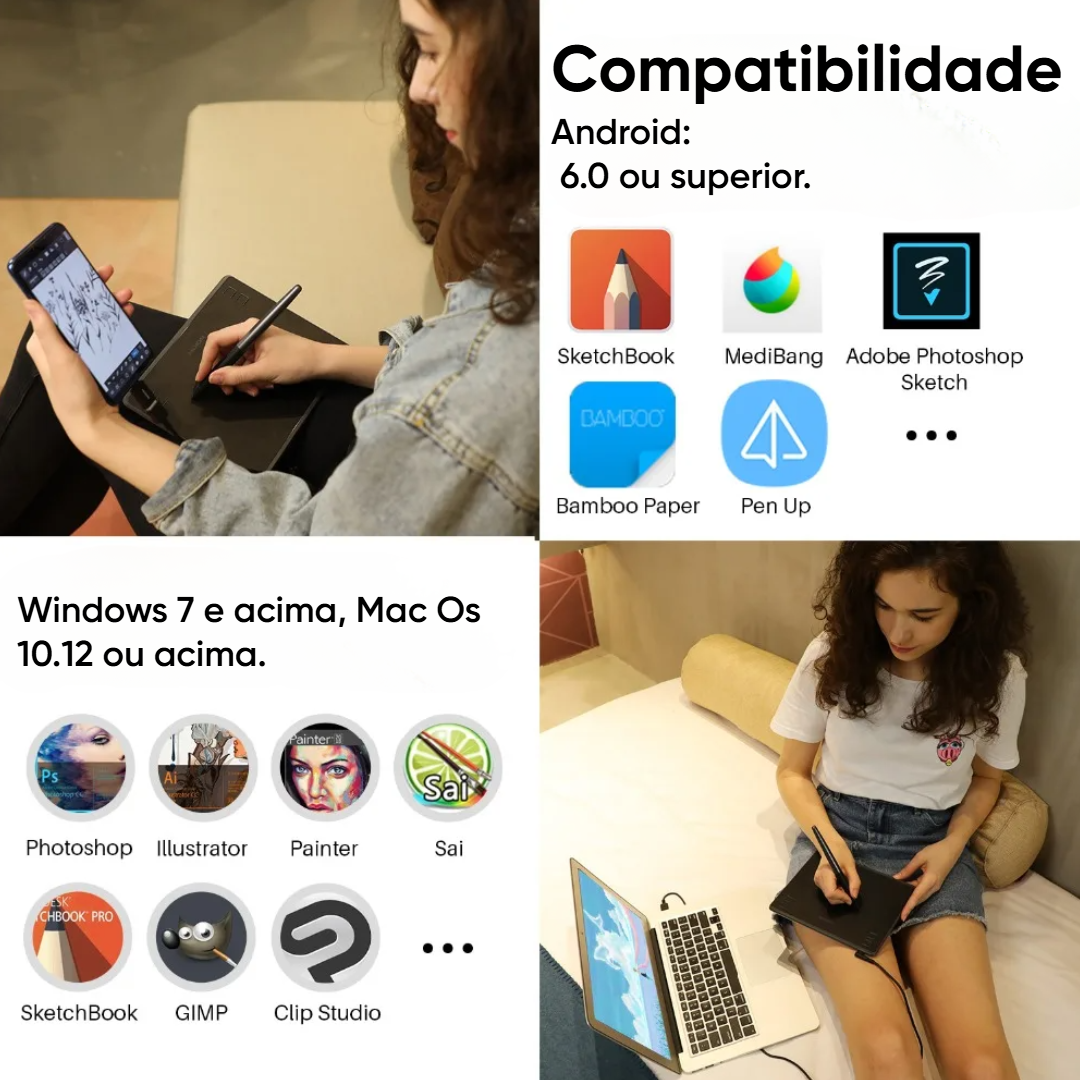 - Inclui adaptadores OTG que permitem a conexão com dispositivos Android, transformando smartphones ou tablets em ferramentas de desenho digitais versáteis.