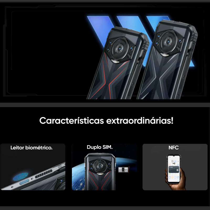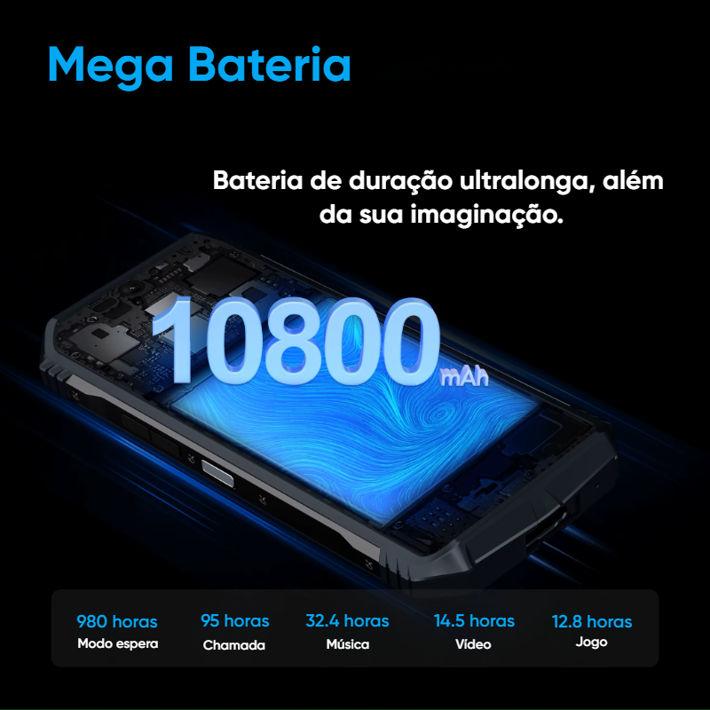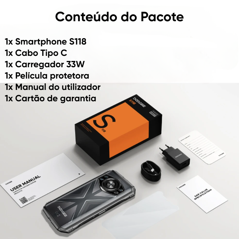 O DOOGEE S118 combina potência, durabilidade e tecnologia de ponta. Seu processador Helio G99 Octa-Core, garante desempenho impecável. Com uma bateria gigante de 10.800mAh e carregamento rápido de 33W, você não fica na mão.